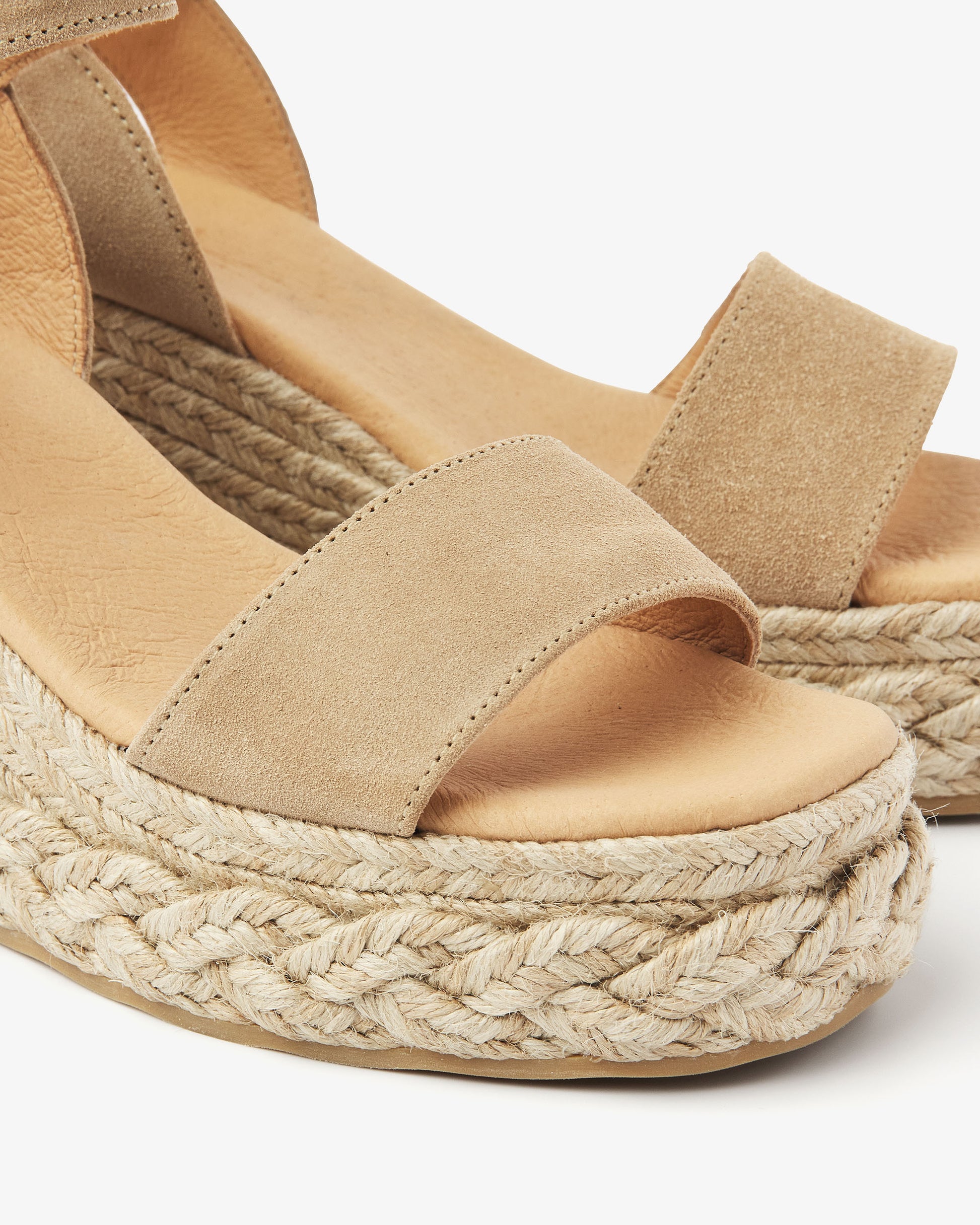 Sommerstemning garanteret. Disse espadrilles i ruskind med elegante kilehæle er den perfekte blanding af komfort og stil. Den justerbare ankelrem sikrer den perfekte pasform, mens remmen over forfoden smukt omslutter din fod. De flettede detaljer på sålen fuldender Capri Neva-sandaler. Et rigtigt must-have for alle skoelskere. Klar til at løfte dit look?
