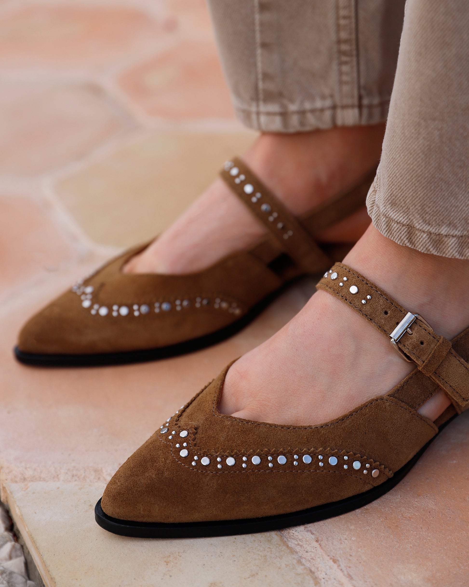 Jazz Yael slingbacks fra VIA VAI giver ethvert outfit et kraftfuldt løft. Kombinationen af blødt ruskind og sølvfarvede nitter skaber et dristigt, men raffineret look. Den spidse tå giver slingbacks et elegant touch, mens remmene omkring hælen og vristen sikrer en behagelig pasform. Ubesværet chic hele dagen lang.