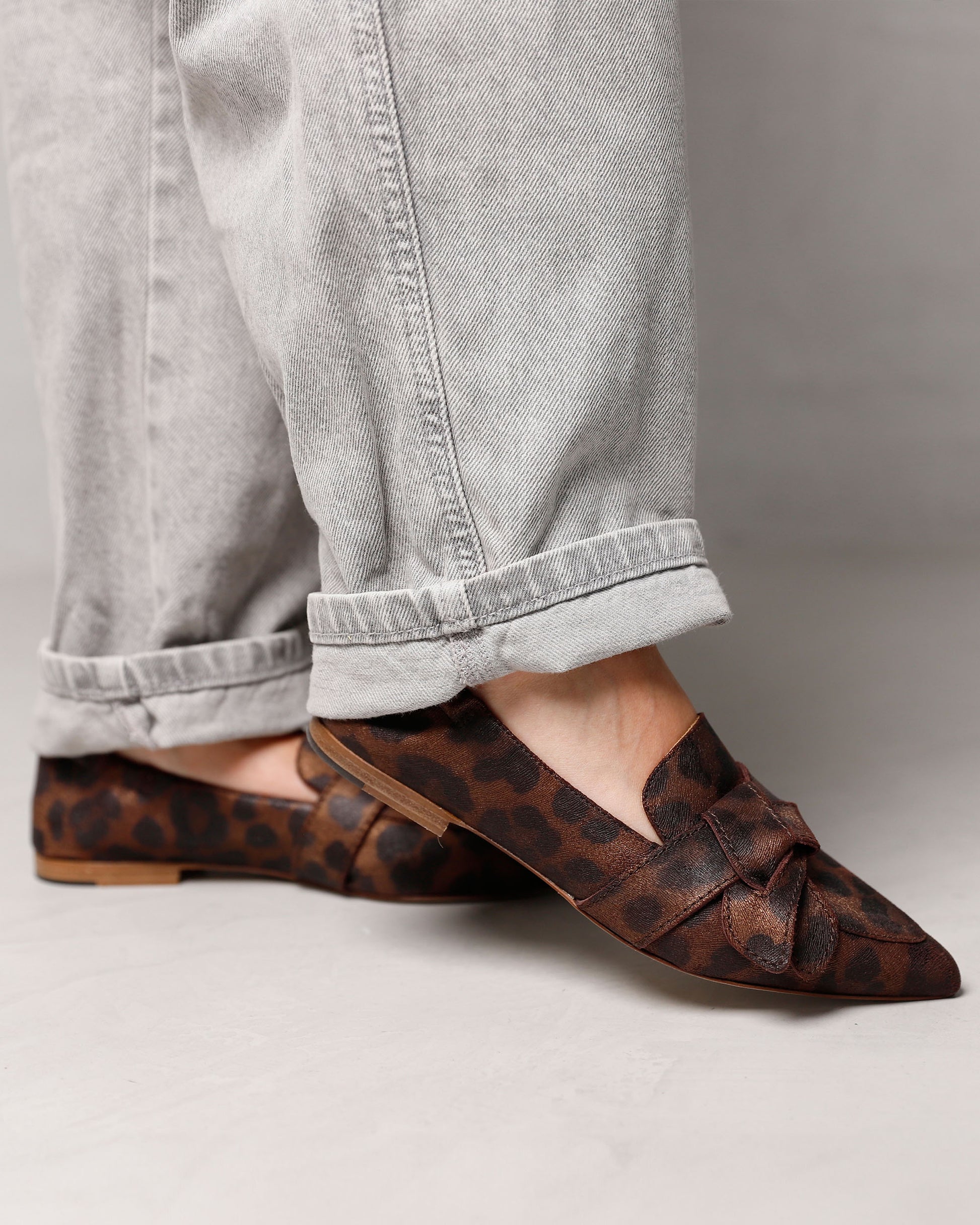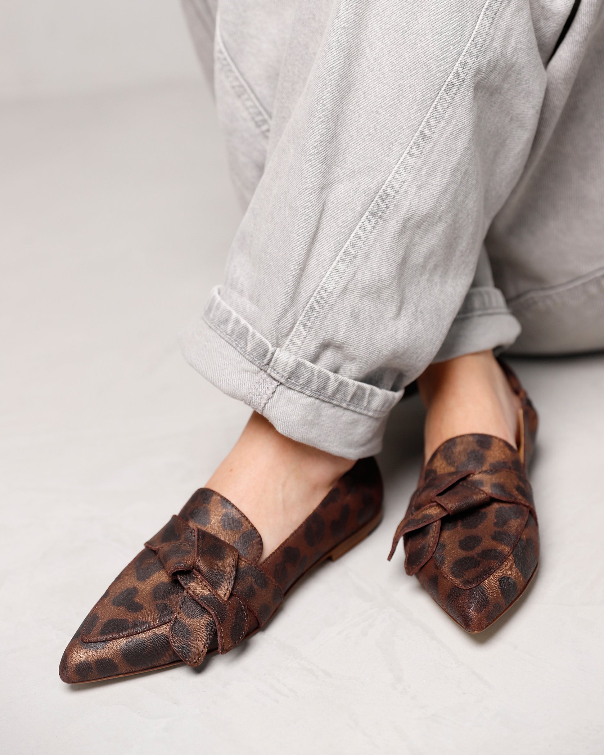 Klassisk, stilfuld og sofistikeret: Det er sådan, vi vil beskrive Lola Rayne. Det, der gør disse loafers unikke, er den elegante 'knude' på vristen, som skaber et ultra-feminint look. De leopardmønstrede loafers har en elastisk hæl og en opskummet fodseng for ekstra komfort.