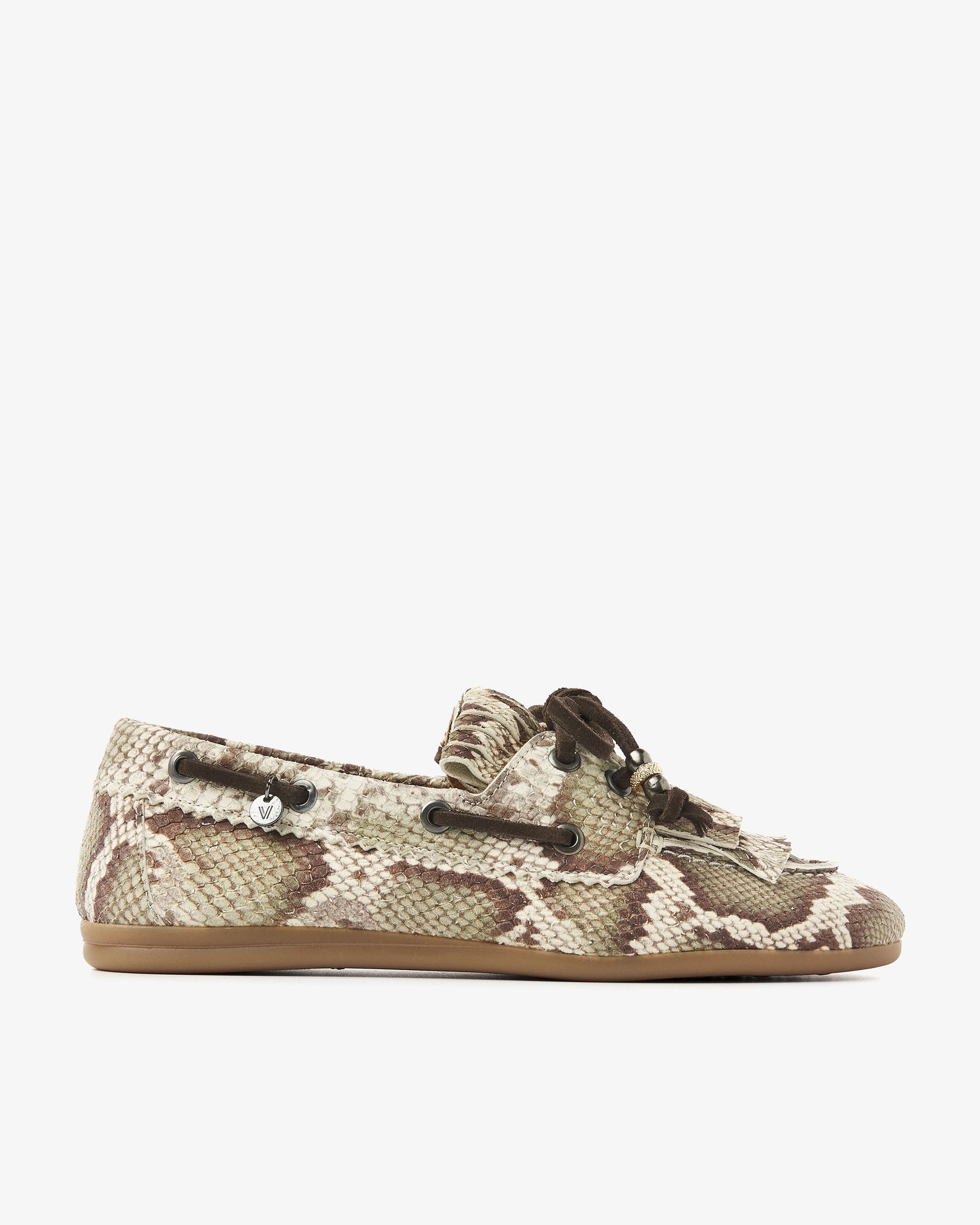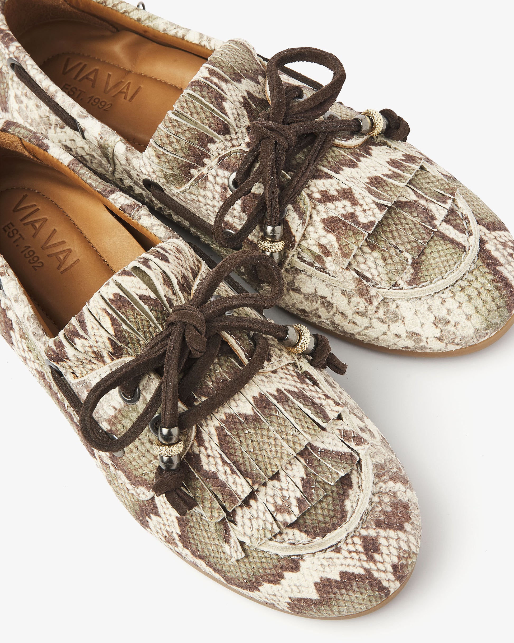 Sometimes you just want a shoe that you can wear with anything, but that has that little bit extra. These snake print moccasins are exactly that. June Loua has a classic moccasin shape with a rounded toe and a flexible, light brown sole made of comfortable rubber. The striking lacing details around the side give it that authentic boat shoe accent, while the fringes on the instep create a playful and casual effect. And that elegant bow with decorative beads? That's what makes June Loua complete!