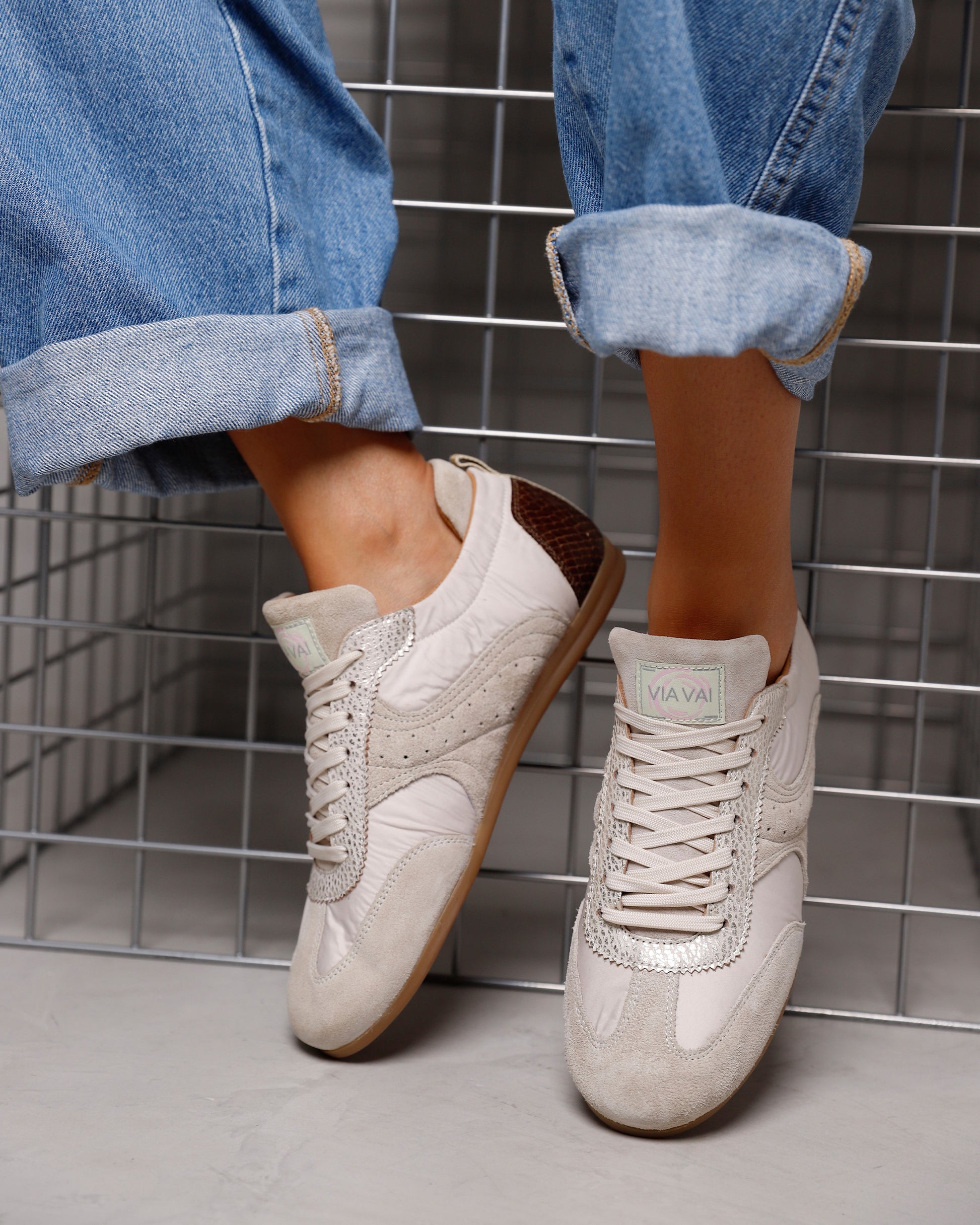 June Haylee can be mixed and matched effortlessly. Go for a casual look with balloon jeans and an oversized blouse or give your outfit a feminine twist with a long skirt and an elegant top. With a few subtle accessories, you can complete this look and really make the playful details of the sneaker stand out.