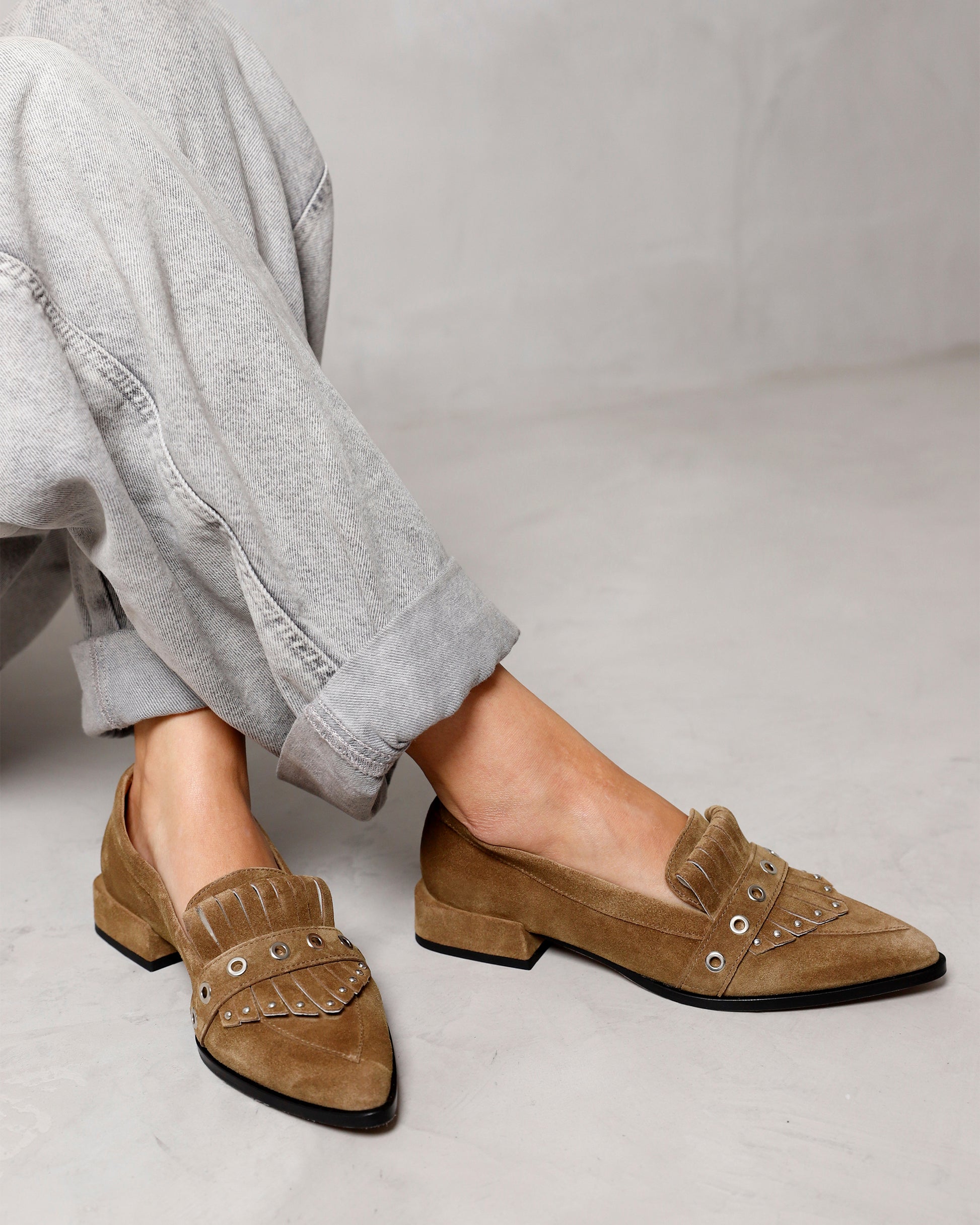 - Fringe details with silver-colored studs on the instep