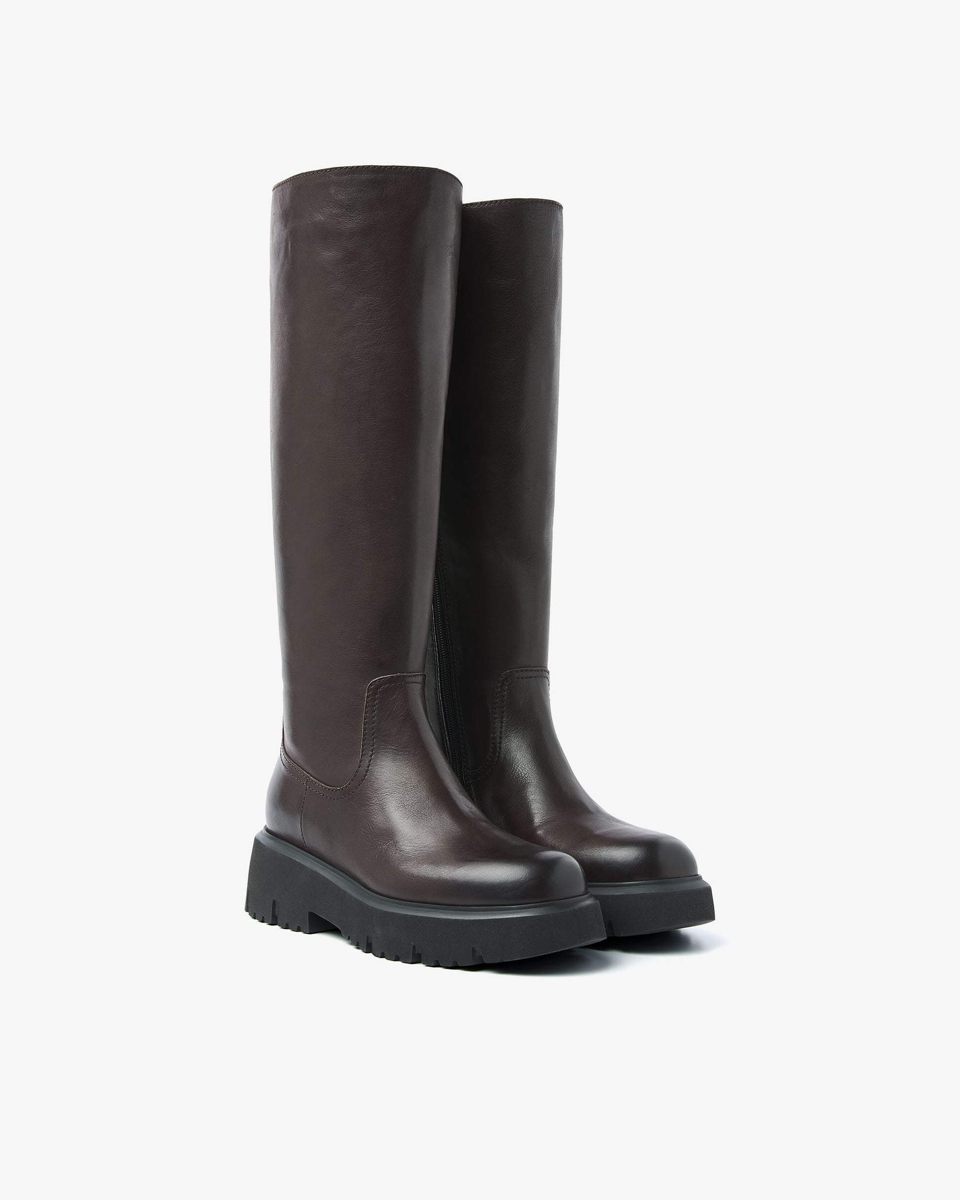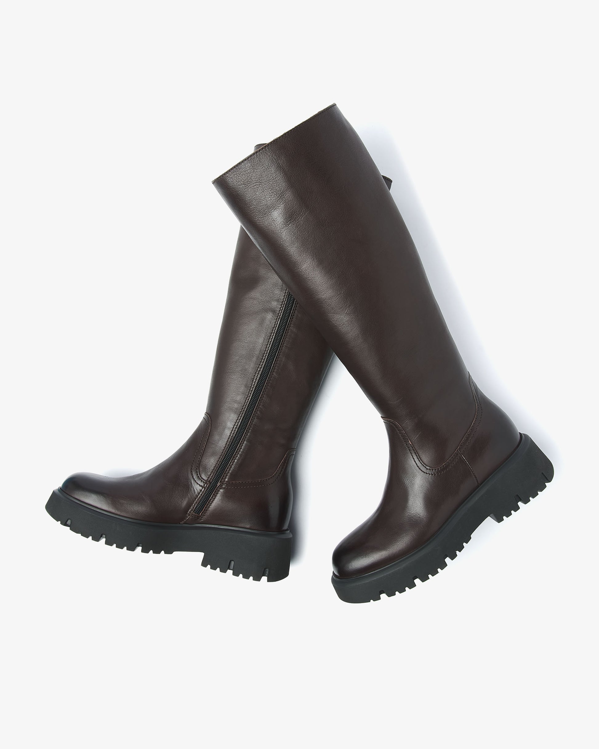 Tough, chunky and minimalist: hello Ziva Vienna! These dark brown high boots are the new key piece in your closet. The leather boots have a high shaft to just below the knee. The lightweight platform sole of these cool VIA VAI boots is super comfortable: you'll literally walk away in no time!