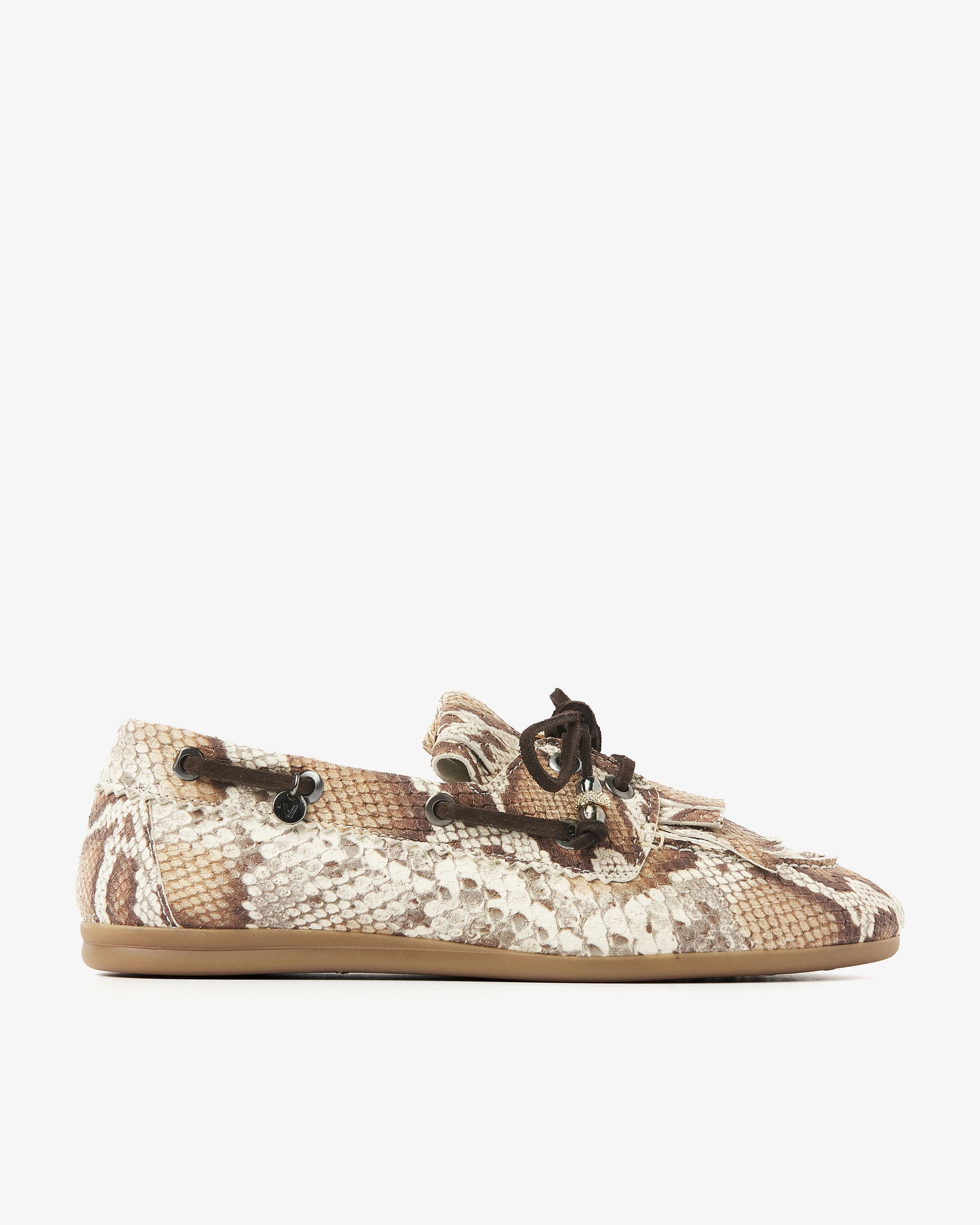 Sometimes you just want a shoe that you can wear with anything, but that has that little bit extra. These snake print moccasins are exactly that. June Loua has a classic moccasin shape with a rounded toe and a flexible, light brown sole made of comfortable rubber. The striking lacing details around the side give it that authentic boat shoe accent, while the fringes on the instep create a playful and casual effect. And that elegant bow with decorative beads? That's what makes June Loua complete!