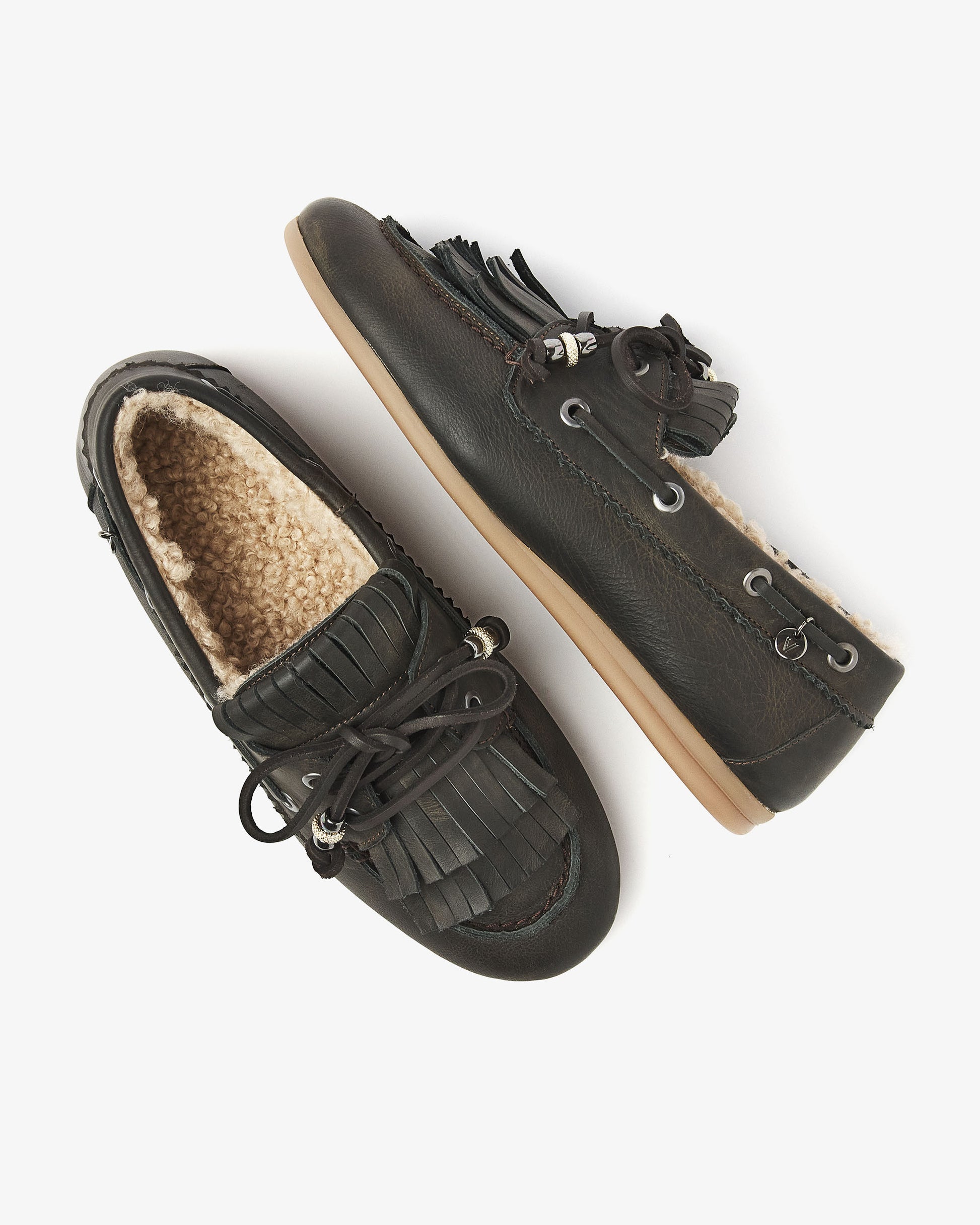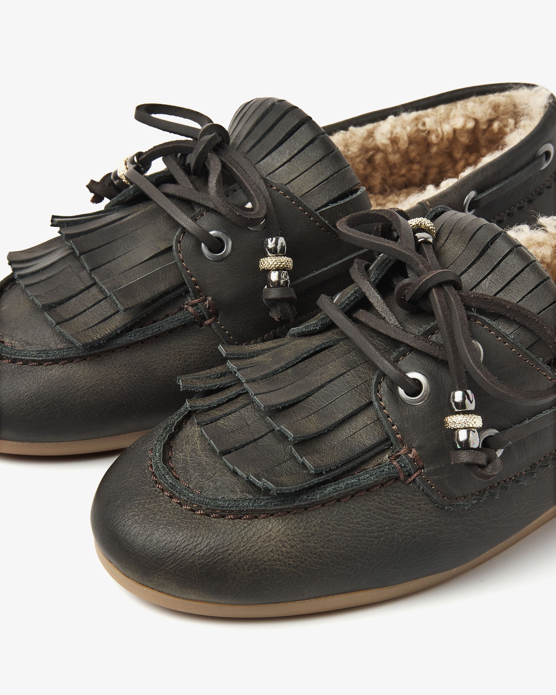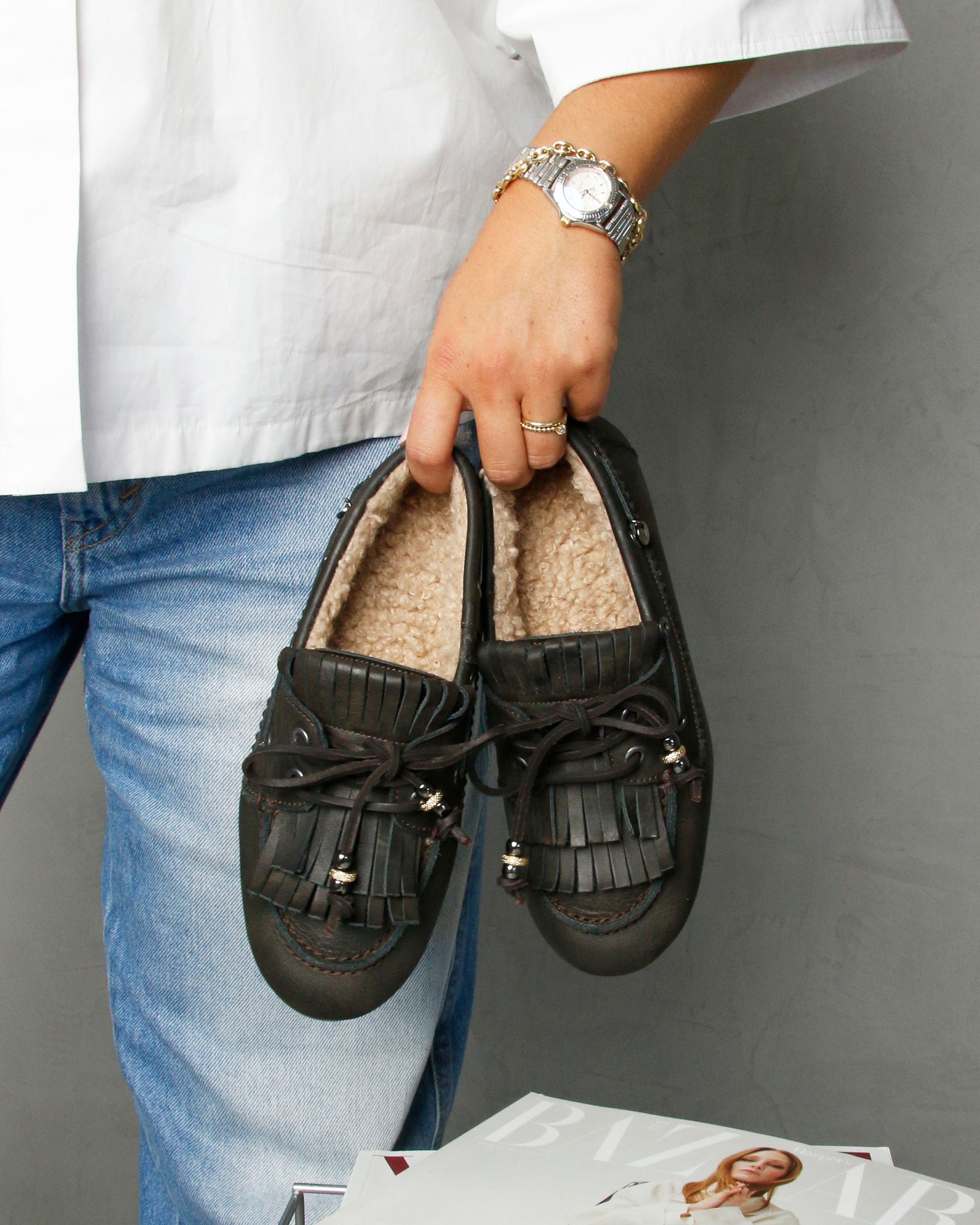 Looking for a shoe that's easy to style but still adds flair to your outfit? These trendy brown moccasins are perfect for you! June Shelby has a faux fur lining, making them wonderfully warm and allowing you to keep wearing them until late autumn. The fringes on the instep add a casual touch, finished off by the decorative beads and striking lace detail.