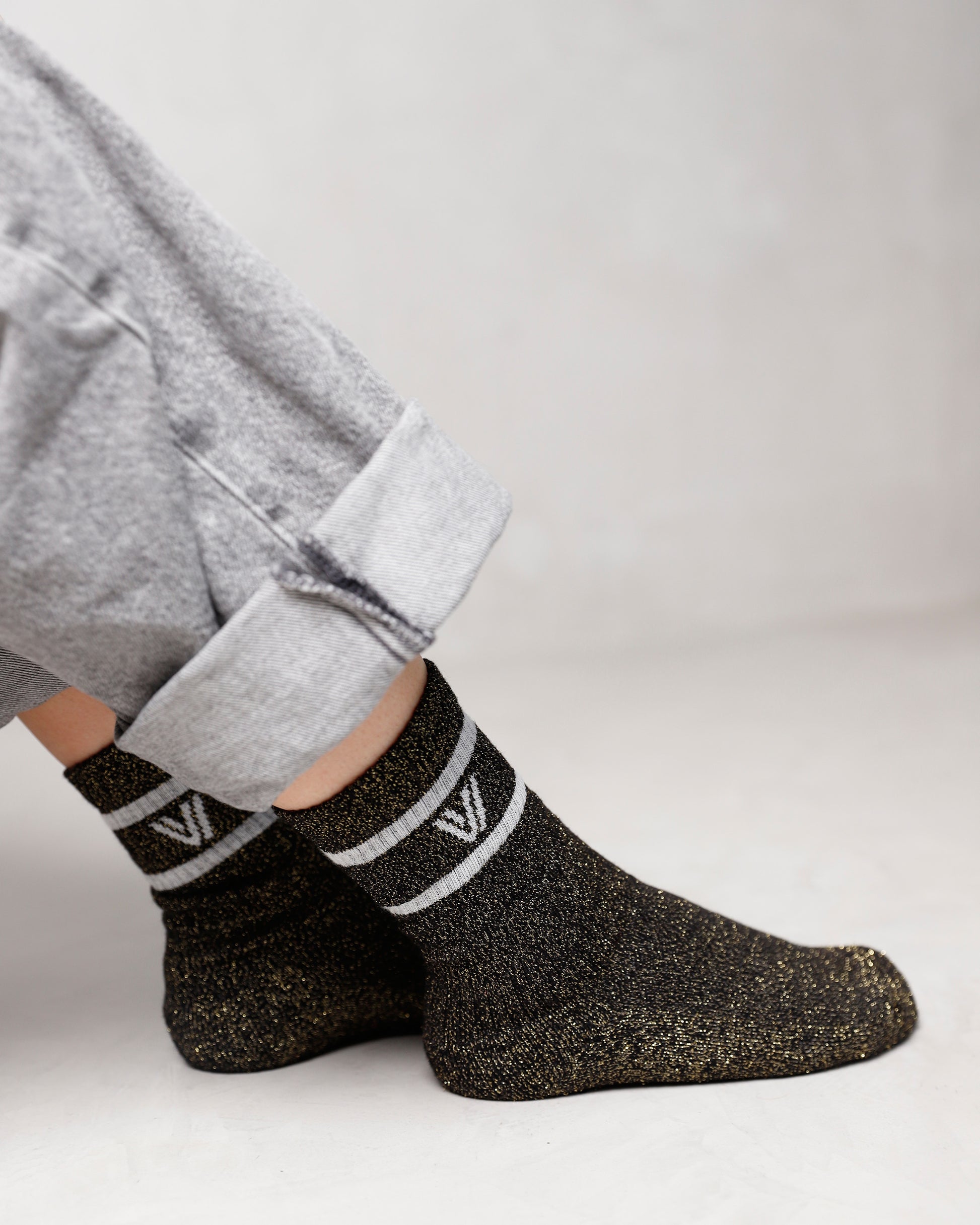 - Black socks with gold-colored lurex