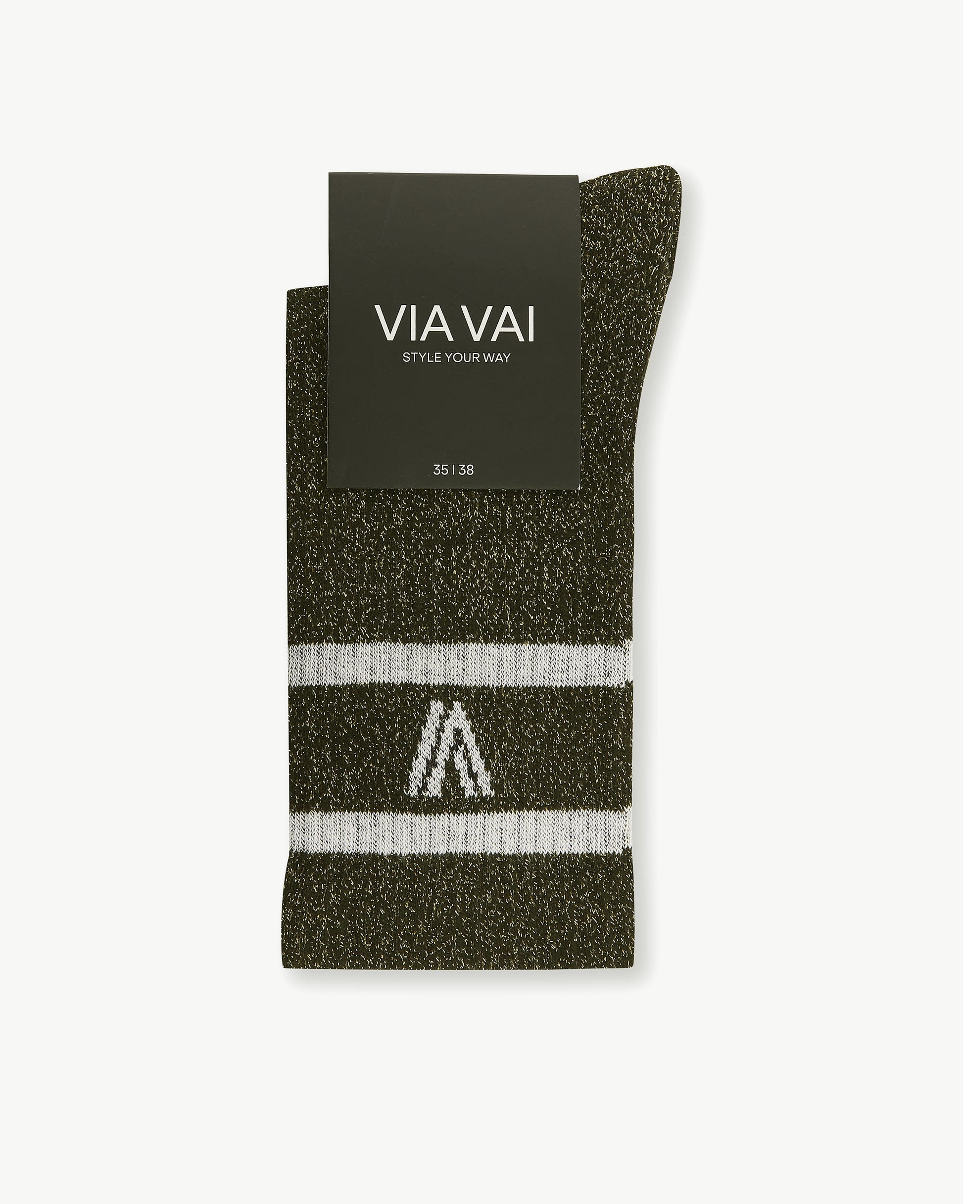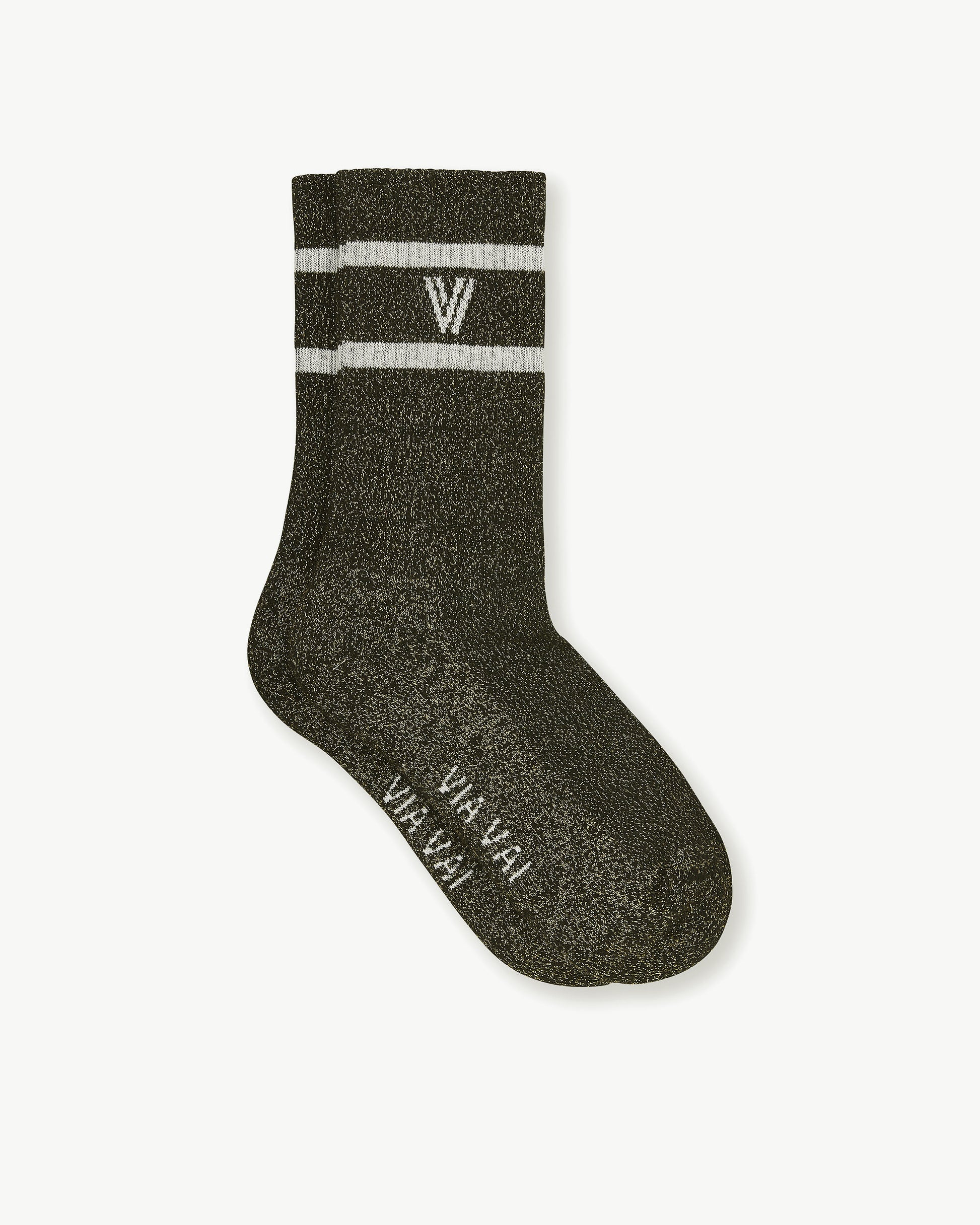 Sporty meets feminine with Lauren Kenna. These stylish socks are the finishing touch to your outfit. The soft socks are made of a cotton mix and finished with a ribbed pattern for a sporty look. Lauren Kenna stands out thanks to the glittering gold lurex that is woven into the black socks. The cool white stripes and the VIA VAI logo just above the ankle complete the look.