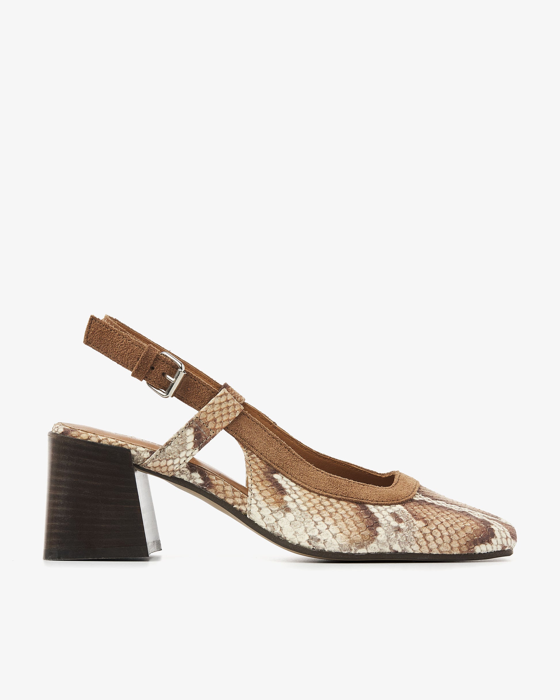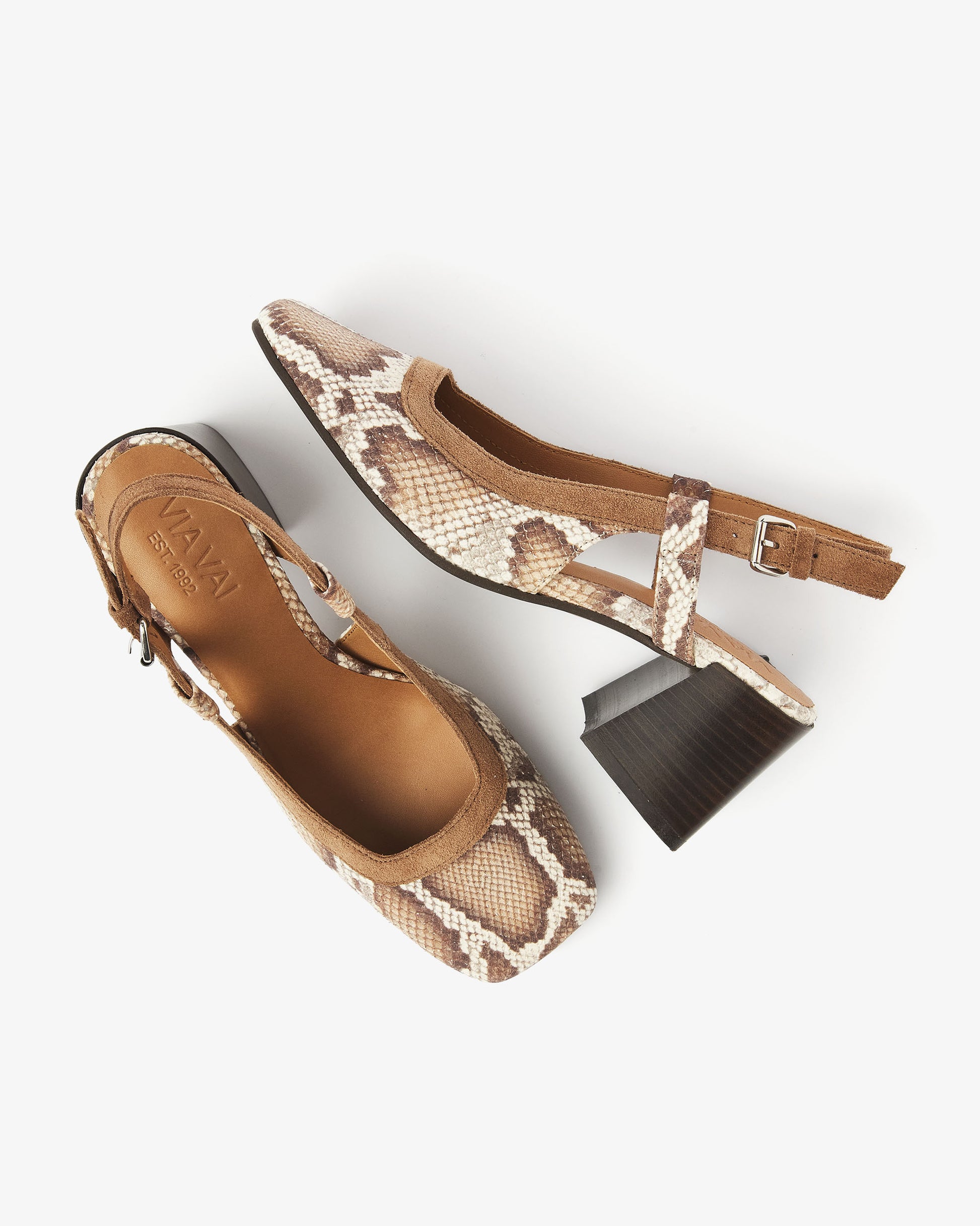 Trend alert! Deze stijlvolle slingback mag niet in jouw schoenen stash ontbreken. De modieuze slangenprint in warme bruin- en beigetinten sluit moeiteloos aan bij de laatste trends. De stevige blokhak geeft een moderne en vrouwelijke uitstraling en zorgt tegelijk voor een stabiele pasvorm. De vierkante neus geeft een eigentijdse twist aan het klassieke silhouet. Laine Michelle is een echte eyecatcher!