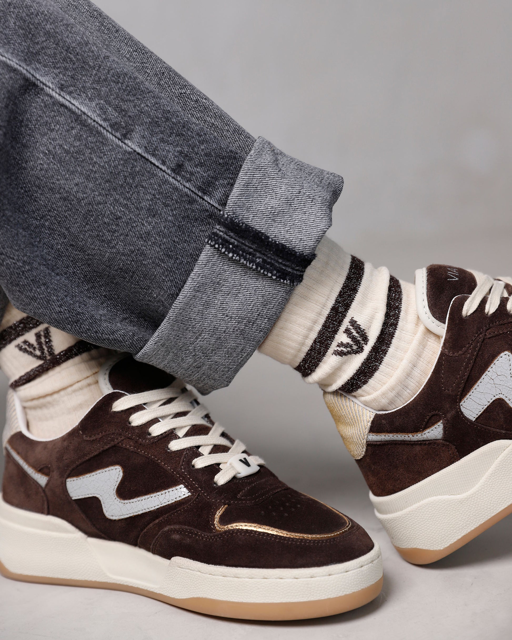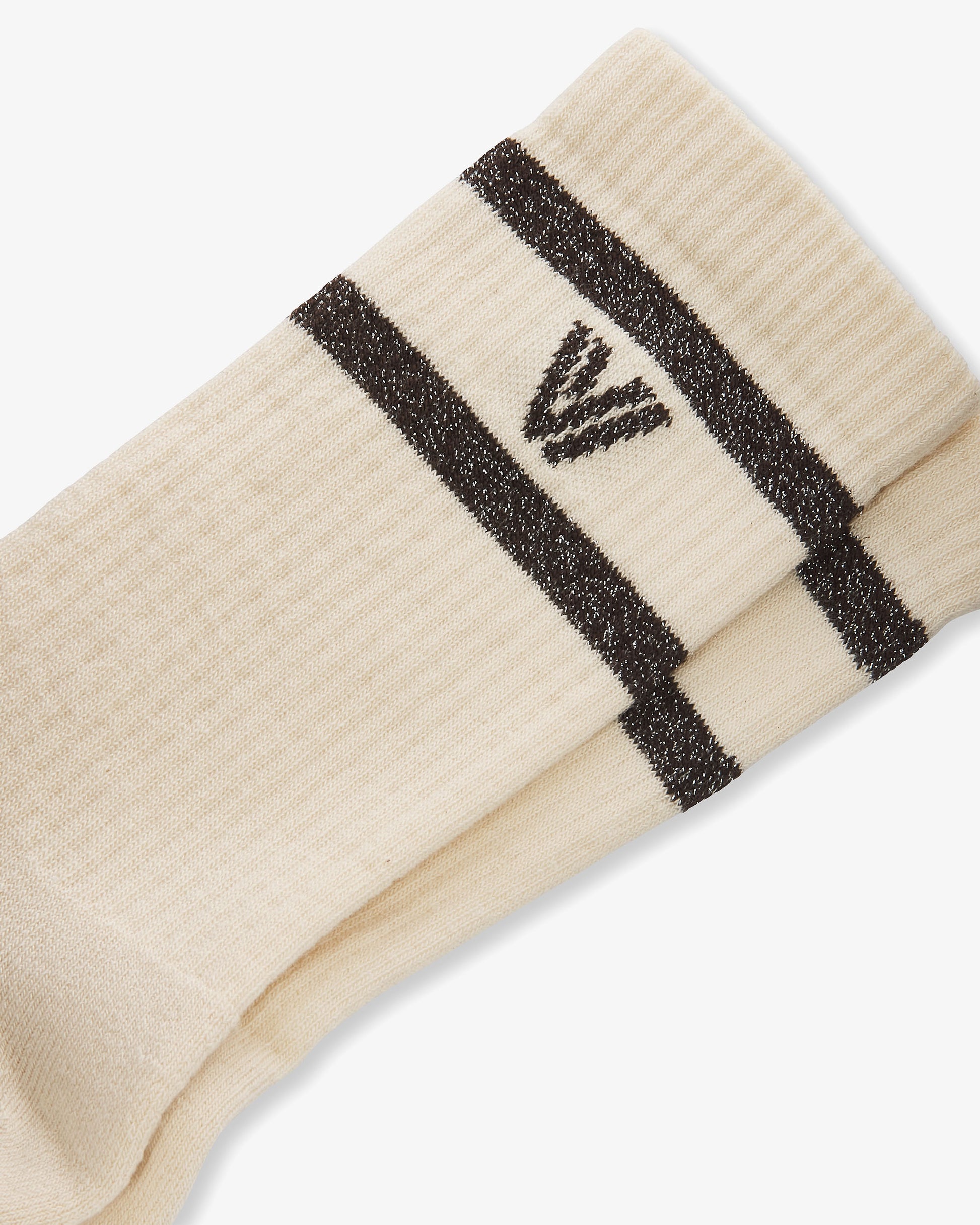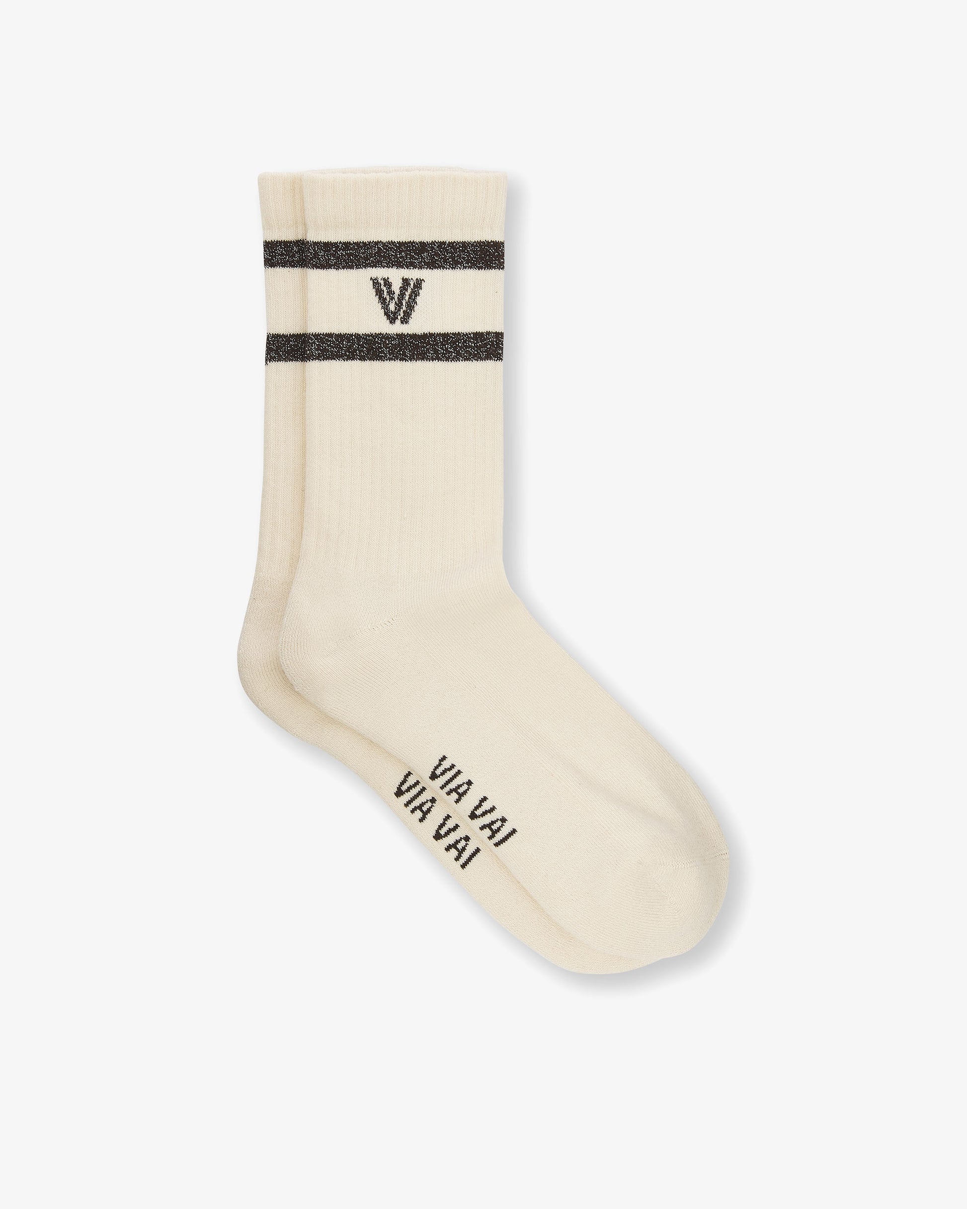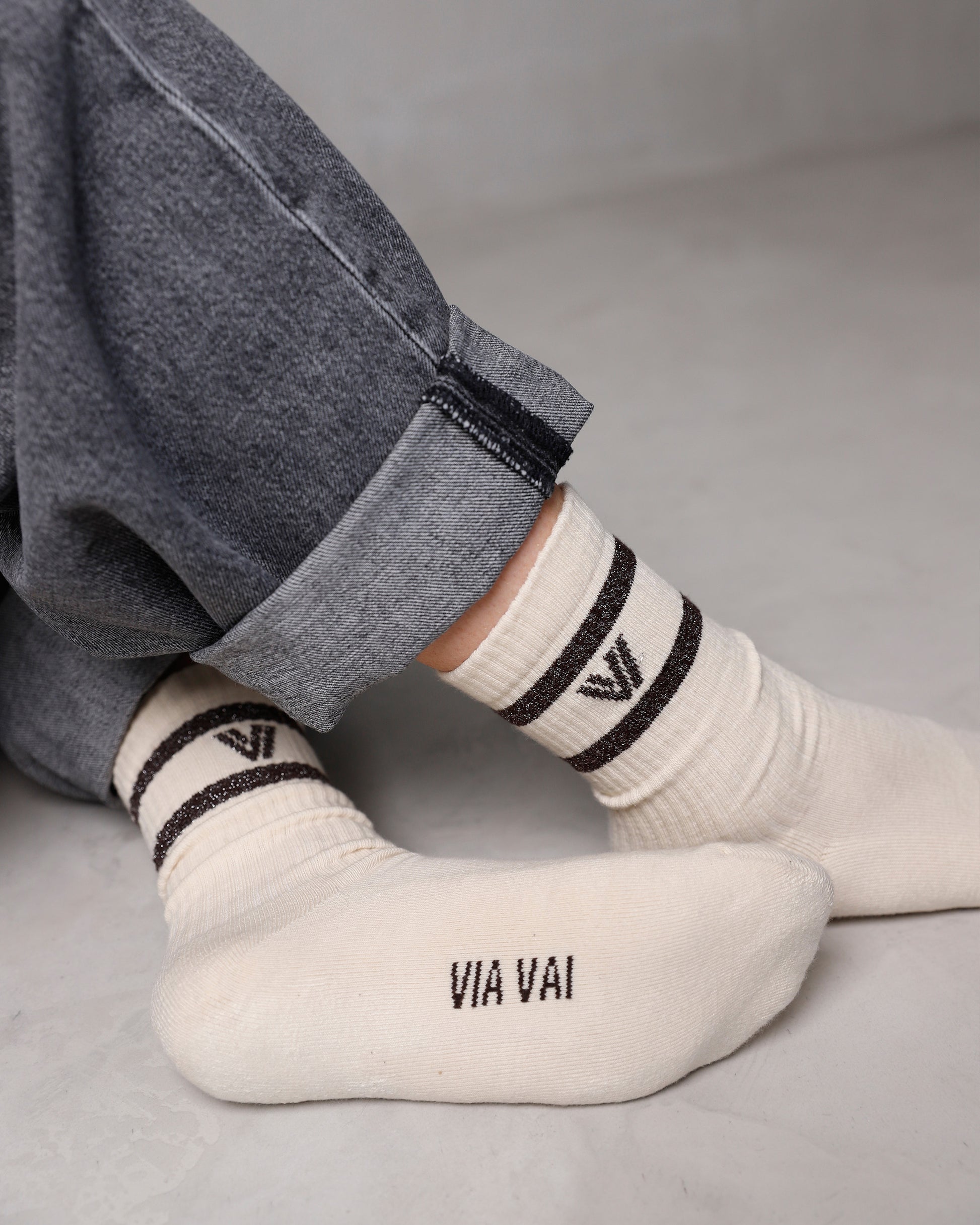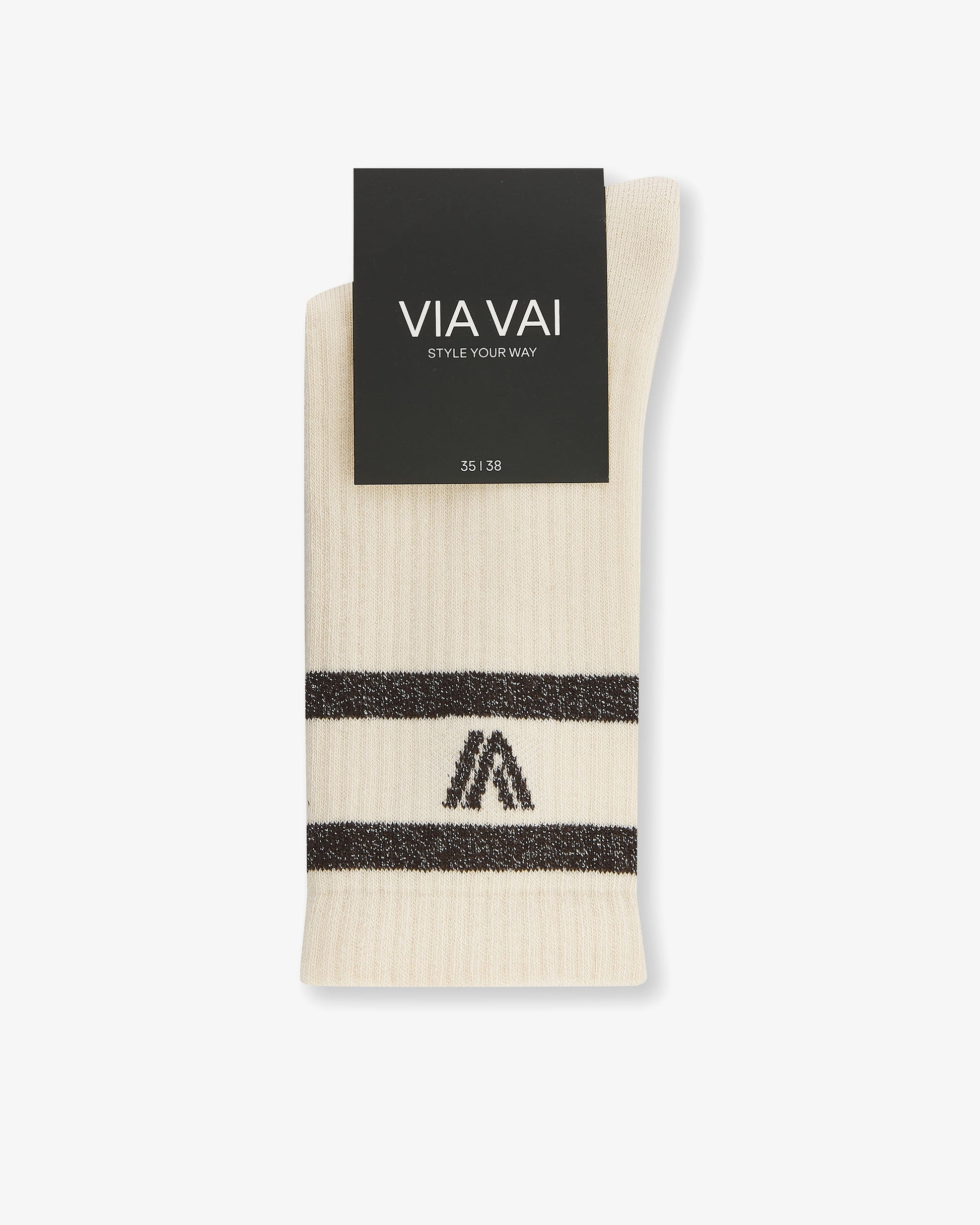 Sporty meets femininemet Lauren Kenna. Deze stylish sokken zijn de finishing touch van jouw outfit. De zachte sokken zijn gemaakt van een katoenmix en afgewerkt met eenribbedpatroon voor een sportieve look. Lauren Kenna valt op dankzij de stoere donkerbruine strepen, waarin zilverkleurig lurex is verwerkt. Het gekleurde VIA VAI logo net boven de enkel maakt de crèmekleurige sokken af.